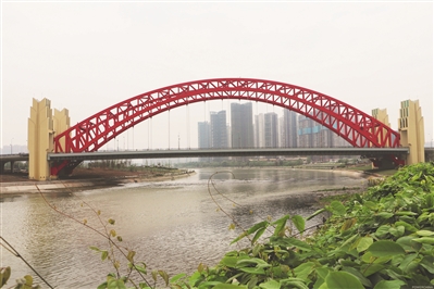 與云龍灣大橋一箭之隔的天保灣大橋全長(zhǎng)880米,主跨230米,橋?qū)?3.5米,采用中承式鋼桁架拱橋施工工藝。目前為成都市同類型橋梁中跨度最長(zhǎng)、橋梁樣式新穎、技術(shù)含量高、施工工序復(fù)雜,且跨越錦江涉水施工。