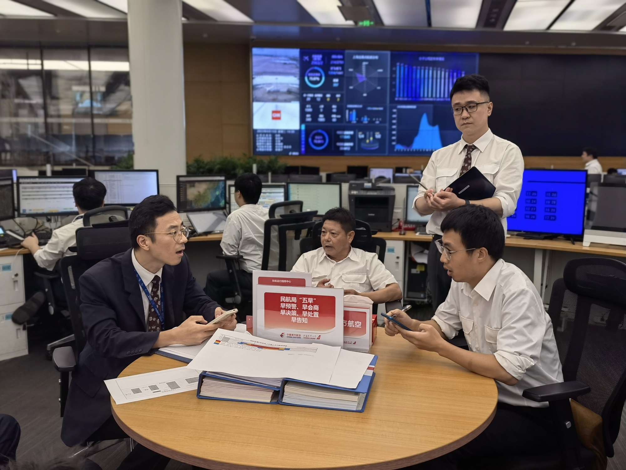 暑運(yùn)期間,東航的航班量高位運(yùn)行,日均客座率、航班量幾乎都維持在80%左右、3000班以上,這就對(duì)航空公司的各項(xiàng)工作提出了更高的要求?!案飨蛔⒁饬?#xff01;馬上到?jīng)Q策區(qū)開(kāi)臺(tái)風(fēng)決策會(huì)?!彪S著陳春益發(fā)出的指令在OCC響起,十幾個(gè)來(lái)自氣象、簽派等不同席位的同事迅速聚集在決策區(qū)內(nèi),共同對(duì)第二天臺(tái)風(fēng)逼近下的航班運(yùn)行開(kāi)始了新一輪研判。
