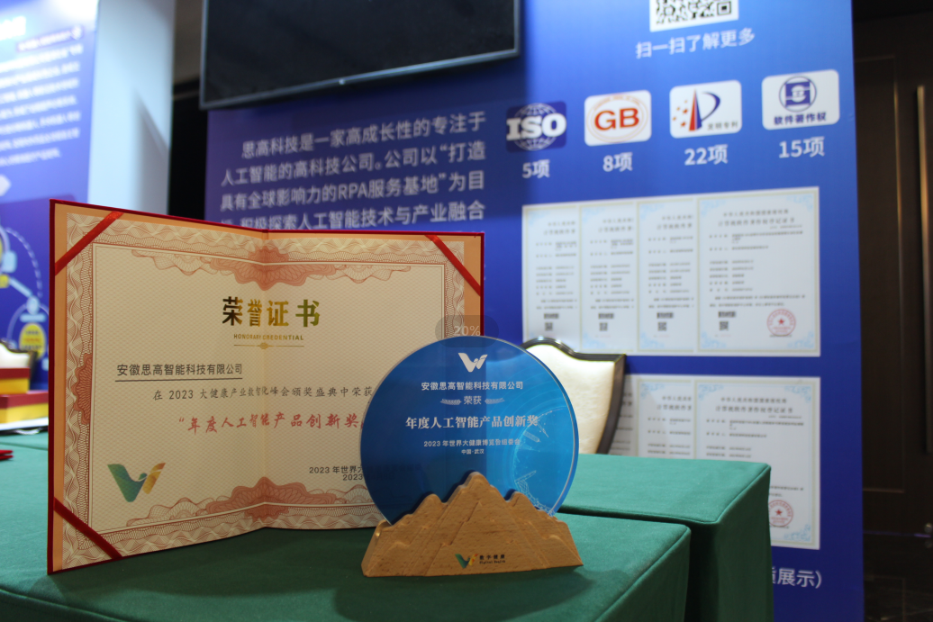 在頒獎環(huán)節(jié)中,思高科技憑借公司核心人工智能軟件產(chǎn)品——“RPA+AI數(shù)字員工”的產(chǎn)品實力和技術(shù)創(chuàng)新榮獲“年度人工智能產(chǎn)品創(chuàng)新獎 ”,思高科技董事長付磊憑借在助推大健康產(chǎn)業(yè)數(shù)字化轉(zhuǎn)型中的突出貢獻(xiàn)榮獲“年度大健康產(chǎn)業(yè)數(shù)字化創(chuàng)新人物獎”,獎項的獲得不僅是對公司人工智能技術(shù)的實力認(rèn)可,也是對公司在大健康產(chǎn)業(yè)的持續(xù)創(chuàng)新和進(jìn)步的肯定。
