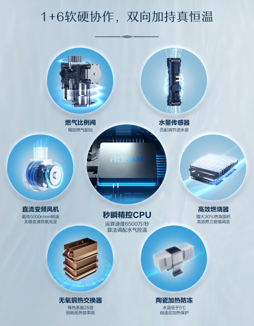 硬件上,【川】系列燃?xì)鉄崴鱄T730搭載秒瞬精控CPU,內(nèi)置全新升級的PID智能算法,可達(dá)6500萬/秒超速運(yùn)算,精準(zhǔn)計(jì)算水氣配比,使燃?xì)獗壤y和水量傳感器快速響應(yīng),迅捷精控持久恒溫。水流量傳感器,可精準(zhǔn)調(diào)節(jié)進(jìn)出口水量,在CPU的配合下實(shí)現(xiàn)水溫恒定;燃?xì)獗壤y,實(shí)時(shí)精控燃?xì)庥昧?#xff0c;高能效穩(wěn)定控溫;高效燃燒器,創(chuàng)新增氧V型火排,增大30%燃燒面積,增強(qiáng)89.68%燃燒效率,削弱15%運(yùn)行噪音,分段穩(wěn)然技術(shù)讓小火中火大火靈活調(diào)控,實(shí)現(xiàn)35-60℃寬幅調(diào)溫。直流變頻風(fēng)機(jī),最高5000r/min轉(zhuǎn)速無極變速高效供氧充足。高效無氧銅熱交換器,除了導(dǎo)熱性耐腐蝕性出色,還具備更強(qiáng)的熱沖擊性能。陶瓷加熱防凍,當(dāng)水溫低至5℃,四個(gè)陶瓷加熱器便會啟動加熱保護(hù),無懼國內(nèi)高寒天氣,-20℃也能安心熱浴。1+6的軟硬件協(xié)作,便可讓【川】系列燃?xì)鉄崴鱄T730輸出澎湃熱水,給予你舒適的沐浴體驗(yàn)與不間斷的溫暖關(guān)懷。