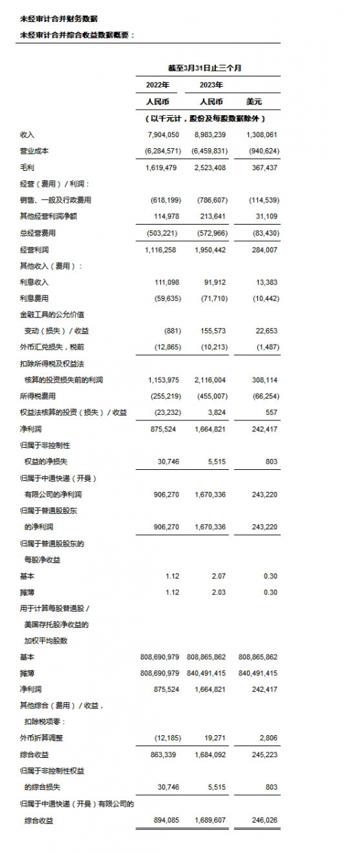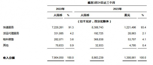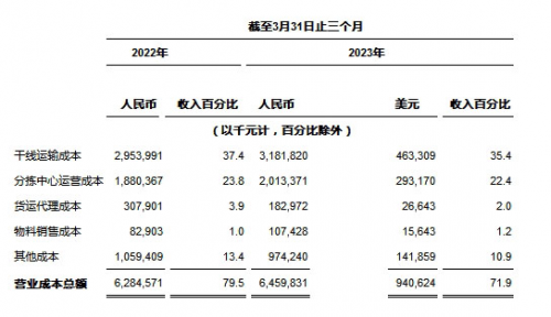 ?收入總額 為人民幣8,983.2百萬元(1,308.1百萬美元),較2022年同期的人民幣7,904.1百萬元增長(zhǎng)13.7%。核心快遞服務(wù)收入較2022年同期增長(zhǎng)16.1%,該增長(zhǎng)是由于包裹量增長(zhǎng)20.5%及單票價(jià)格下降3.7%的綜合影響所致。貨運(yùn)代理服務(wù)收入較2022年同期減少41.8%,該減少主要是由于全球經(jīng)濟(jì)疲弱導(dǎo)致跨境電商需求和定價(jià)下降所致。物料銷售收入主要由打印電子面單所需的熱敏紙銷售收入組成,同比增長(zhǎng)30.8%,該等增長(zhǎng)與包裹量增長(zhǎng)趨勢(shì)吻合。其他收入主要由金融貸款業(yè)務(wù)組成。