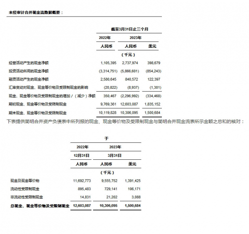 ? 經(jīng)營(yíng)活動(dòng)產(chǎn)生的現(xiàn)金凈額為人民幣2,738.0百萬元(398.7百萬美元),而2022年同期為人民幣1,105.4百萬元。