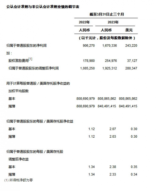 ? 基本及攤薄每股美國存托股(「美國存托股」[4])凈收益為人民幣2.07元(0.30美元)及人民幣2.03元(0.30美元),較2022年同期的人民幣1.12元及人民幣1.12元分別增長(zhǎng)84.8%及81.3%。