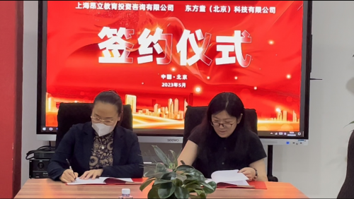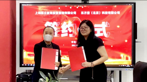 東方童(北京)科技有限公司文化傳媒事業(yè)部總經(jīng)理尹健穎、上海昂立教育投資咨詢有限公司研學(xué)項目負(fù)責(zé)人金玫伶舉行簽約儀式