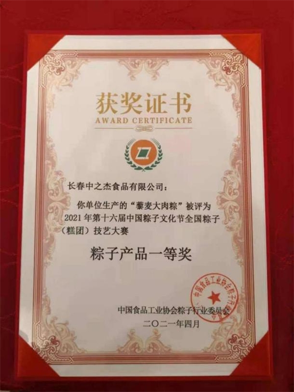 2021年,由中國(guó)食品行業(yè)協(xié)會(huì)舉辦的第16屆中國(guó)粽子文化節(jié)頒獎(jiǎng)儀式上,中之杰“藜麥大黃米粽”獲得最佳創(chuàng)新獎(jiǎng)、“藜麥大肉粽”獲得一等獎(jiǎng)、“藜麥大黃米湯圓”獲得特等獎(jiǎng),可謂是滿譽(yù)而歸。并且這已經(jīng)是中之杰在中國(guó)粽子文化節(jié)上連續(xù)5年蟬聯(lián)最高榮譽(yù)。