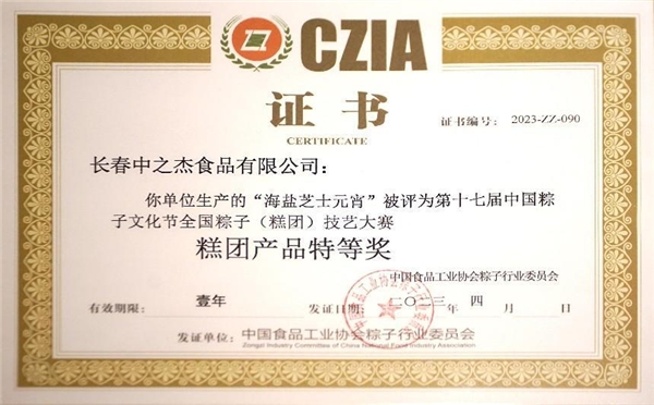 2023年4月19日,中之杰再次驚艷亮相中國(guó)粽子文化節(jié),一舉斬獲三項(xiàng)全國(guó)大獎(jiǎng)。中之杰的梅肉黑松露粽作為創(chuàng)新產(chǎn)品,從原料、工藝、口感、顏值等各個(gè)方面都受到行業(yè)專家推崇,同時(shí)斬獲全國(guó)(糕團(tuán))技藝大賽雙冠王——大賽最高獎(jiǎng)項(xiàng)“粽子產(chǎn)品特等獎(jiǎng)”和“粽子產(chǎn)品創(chuàng)新獎(jiǎng)”,中之杰海鹽芝士炸不爆元宵榮獲全國(guó)(糕團(tuán))技藝大賽最高獎(jiǎng)項(xiàng)“糕團(tuán)產(chǎn)品特等獎(jiǎng)”。