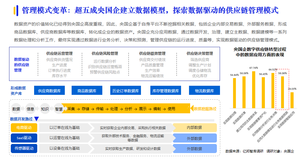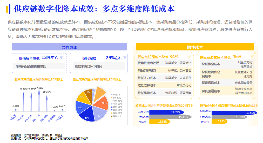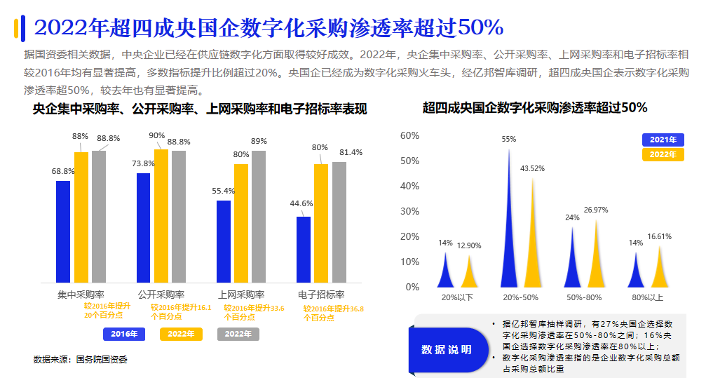 央國(guó)企在我國(guó)企業(yè)采購(gòu)數(shù)字化進(jìn)程中的火車頭效應(yīng)越發(fā)明顯。據(jù)億邦智庫(kù)調(diào)研,超四成央國(guó)企表示數(shù)字化采購(gòu)滲透率已經(jīng)超過(guò)50%;形成了央國(guó)企先行,引發(fā)供應(yīng)鏈各環(huán)節(jié)企業(yè)參與數(shù)字化創(chuàng)新變革的發(fā)展態(tài)勢(shì)。