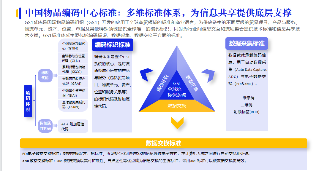 統(tǒng)一物品編碼標(biāo)準(zhǔn)一直是采購(gòu)供應(yīng)鏈領(lǐng)域的重點(diǎn)和難點(diǎn)。中國(guó)物品編碼中心的GS1系統(tǒng)是國(guó)際物品編碼組織(GS1)開(kāi)發(fā)的應(yīng)用于全球商貿(mào)領(lǐng)域的標(biāo)準(zhǔn)和商業(yè)語(yǔ)言,為供應(yīng)鏈中的不同層級(jí)的貿(mào)易項(xiàng)目、產(chǎn)品與服務(wù)、物流單元、資產(chǎn)、位置、單據(jù)及其他特殊領(lǐng)域提供全球唯一的編碼標(biāo)識(shí),同時(shí)為行業(yè)間信息交互和流程整合提供技術(shù)標(biāo)準(zhǔn)和信息共享技術(shù)支撐。