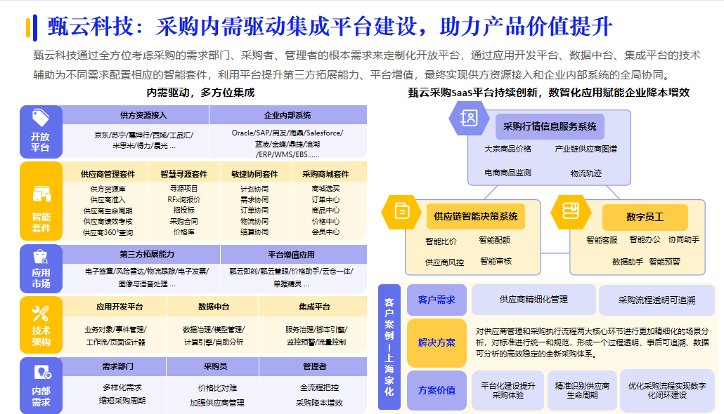 再例如,甄云科技通過(guò)全方位考慮采購(gòu)的需求部門、采購(gòu)者、管理者的根本需求來(lái)定制化開(kāi)放平臺(tái),實(shí)現(xiàn)供方資源接入和企業(yè)內(nèi)部系統(tǒng)的全局協(xié)同。