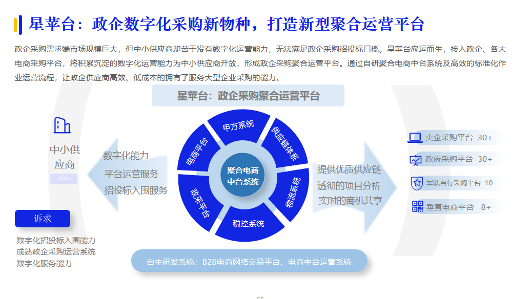 業(yè)務(wù)+數(shù)據(jù)的雙中臺(tái)模式,也是今年技術(shù)服務(wù)商在中臺(tái)方面的創(chuàng)新看點(diǎn)。從業(yè)務(wù)系統(tǒng)獲取的信息經(jīng)過(guò)數(shù)據(jù)中臺(tái)的處理,再經(jīng)過(guò)業(yè)務(wù)中臺(tái)的分析后,為企業(yè)提供智能決策支持。例如,星蘋臺(tái)通過(guò)自研聚合電商中臺(tái)系統(tǒng),接入政企、各大電商采購(gòu)平臺(tái),將積累沉淀的數(shù)字化運(yùn)營(yíng)能力為中小供應(yīng)商開(kāi)放,讓其擁有了服務(wù)大型企業(yè)采購(gòu)的能力。