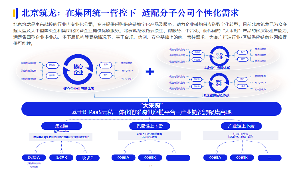針對(duì)企業(yè)既要滿足標(biāo)準(zhǔn)化,又要滿足定制化業(yè)務(wù)需求,PaaS提供的服務(wù)更具有拓展性、集中性、適配性更強(qiáng)。北京筑龍基于多租戶體系,構(gòu)建了大采購(gòu)云私一體化B-PaaS平臺(tái),既滿足多層級(jí)集中管理管控需求,又為下屬管理及執(zhí)行機(jī)構(gòu)提供更多個(gè)性化、自主性選擇,進(jìn)而適應(yīng)集團(tuán)多元化和業(yè)務(wù)單元專業(yè)化發(fā)展。