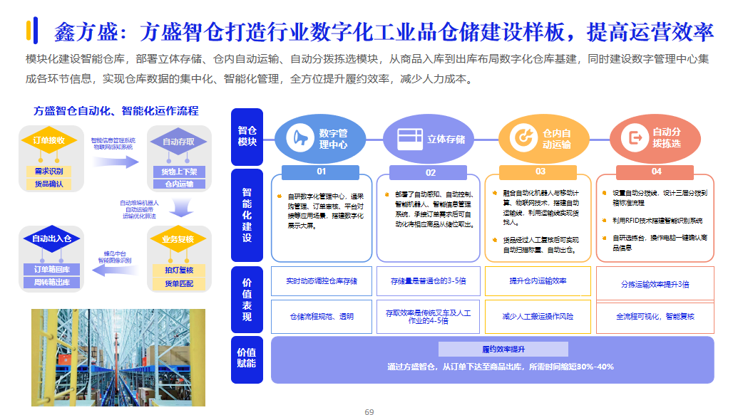 履約能力是供應(yīng)商的核心競(jìng)爭(zhēng)力。在履約服務(wù)方面,為了提高履約交付效率,供應(yīng)商加大AI等技術(shù)投入應(yīng)用,建設(shè)智能倉(cāng)儲(chǔ)、智慧物流等數(shù)智供應(yīng)鏈體系。例如,鑫方盛的方盛智倉(cāng)打造行業(yè)數(shù)字化工業(yè)品倉(cāng)儲(chǔ)建設(shè)樣板,實(shí)現(xiàn)倉(cāng)庫(kù)數(shù)據(jù)的集中化、智能化管理,全方位提升履約效率,減少人力成本。