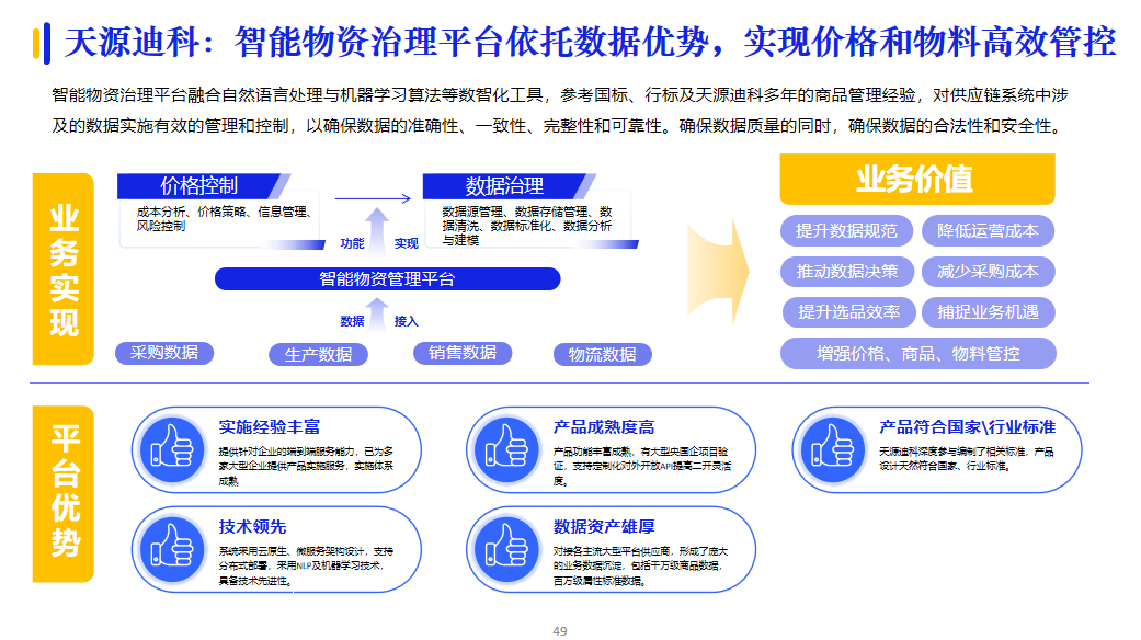 部分央國(guó)企會(huì)根據(jù)企業(yè)自身的數(shù)字化薄弱點(diǎn),采取有針對(duì)性地補(bǔ)齊斷點(diǎn)的實(shí)施策略,包括供建立應(yīng)商協(xié)同管理系統(tǒng)、優(yōu)化物資分類與編碼設(shè)計(jì)、建立供應(yīng)商管理體系、建設(shè)電商采購(gòu)平臺(tái)、設(shè)計(jì)倉(cāng)儲(chǔ)管理體系等內(nèi)容。例如:天源迪科在智能物資治理方面,提出了價(jià)格和物料高效管控的解決方案,有效確保價(jià)格數(shù)據(jù)的合法性和安全性。