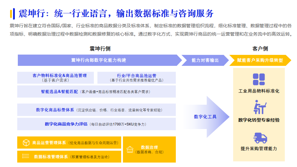 為企業(yè)提供場(chǎng)景、行業(yè)適配的產(chǎn)品與服務(wù)是供應(yīng)商的基礎(chǔ)能力??梢越柚鶤I等數(shù)字化技術(shù)服務(wù),基于場(chǎng)景梳理的標(biāo)準(zhǔn)化實(shí)現(xiàn)商品智能匹配,已經(jīng)成為供應(yīng)商服務(wù)升級(jí)的方向。例如:震坤行通過(guò)建立國(guó)際/國(guó)家、行業(yè)標(biāo)準(zhǔn)的商品數(shù)據(jù)分類及標(biāo)準(zhǔn)體系,明確數(shù)據(jù)治理過(guò)程中數(shù)據(jù)檢測(cè)和數(shù)據(jù)修復(fù)的核心標(biāo)準(zhǔn),再基于場(chǎng)景梳理,建立數(shù)字化商品標(biāo)簽體系,實(shí)現(xiàn)震坤行商品的統(tǒng)一運(yùn)營(yíng)管理和在業(yè)務(wù)流中的高效運(yùn)轉(zhuǎn)。