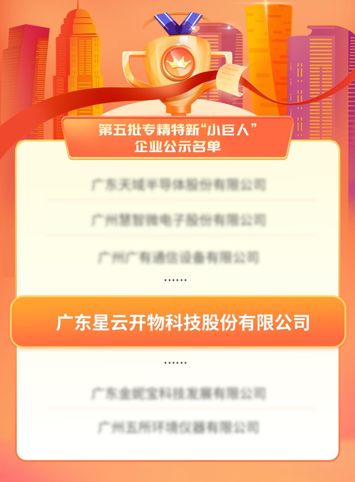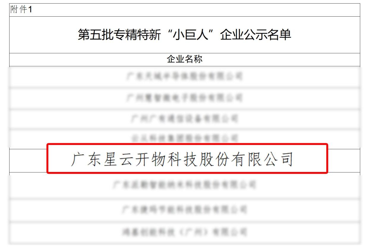 ? ? 7月14日,國家工信部發(fā)布了《關于廣東省第五批專精特新“小巨人”企業(yè)和第二批專精特新“小巨人”復核通過企業(yè)名單的公示》,廣東「星云開物」科技股份有限公司以優(yōu)異的綜合實力成功入選,榮列2023年國家級第五批專精特新“小巨人”企業(yè)公示名單。