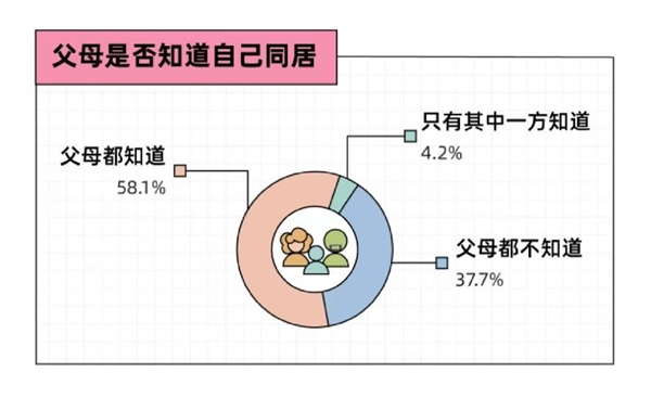 尤其值得注意的是,根據(jù)《報(bào)告》,37.7%的年輕人壓根就沒(méi)讓父母知道自己已經(jīng)同居,還有4.2%的受訪者表示只讓父母中的一方知道情況。畢竟,父母對(duì)待同居的態(tài)度相對(duì)保守,尤其是女方,《報(bào)告》顯示僅有約三分之一的父母支持女生同居。
