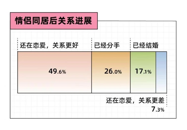不管終極目標(biāo)是否是結(jié)婚,49.6%的情侶表示,同居后感情更好了。還有17.1%的人已經(jīng)走進(jìn)婚姻的殿堂。顯然,同居生活沒(méi)能拆散情侶們,反觀其在親密關(guān)系中的積極影響倒是不少。
