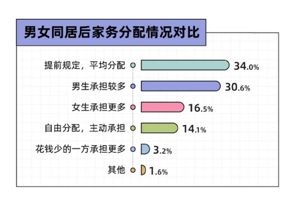 令人意外的是,《報(bào)告》顯示,“男生承擔(dān)更多家務(wù)”的比例為30.6%,高于女生(16.5%),完全顛覆了刻板認(rèn)知。此前的一項(xiàng)調(diào)查也顯示,同居后,男生們的“居家能力”大幅提升,提升幅度甚至超過(guò)女生,不過(guò)在結(jié)婚后又會(huì)有所下降。