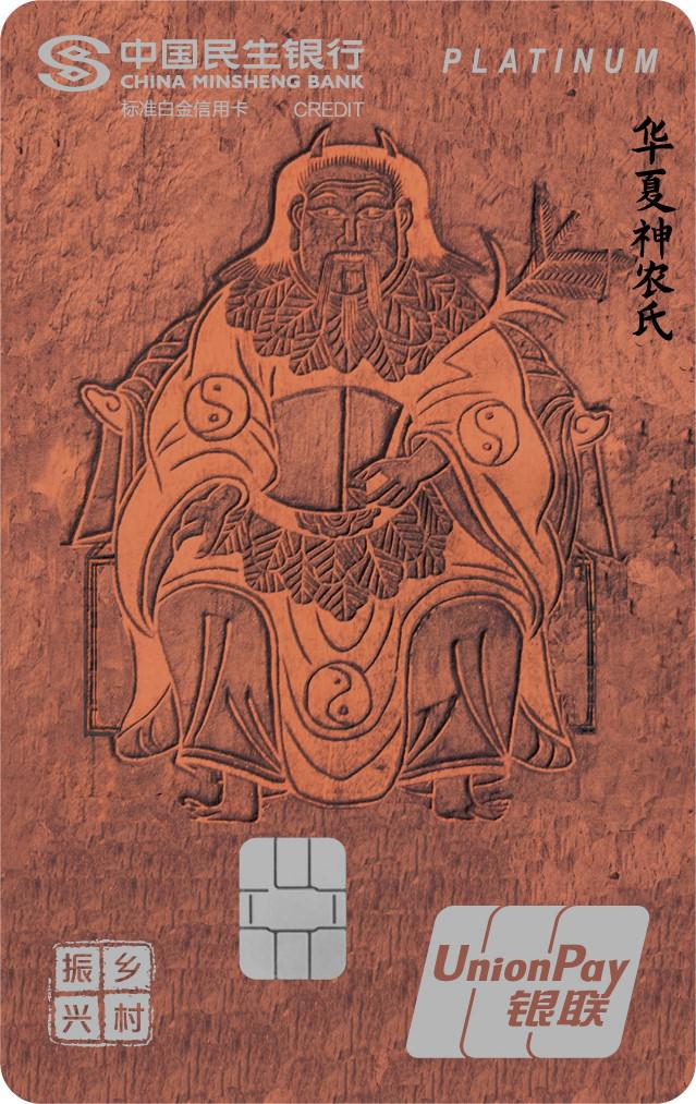 該卡首次采用民生銀行定點幫扶縣——河南省滑縣國家級非遺木版年畫為版面,卡面以華夏神農(nóng)氏為主形象,形象地描繪出農(nóng)耕文化和民族風(fēng)情,展現(xiàn)了中華傳統(tǒng)美術(shù)工藝,為金融機構(gòu)助力鄉(xiāng)村振興又添碩果。