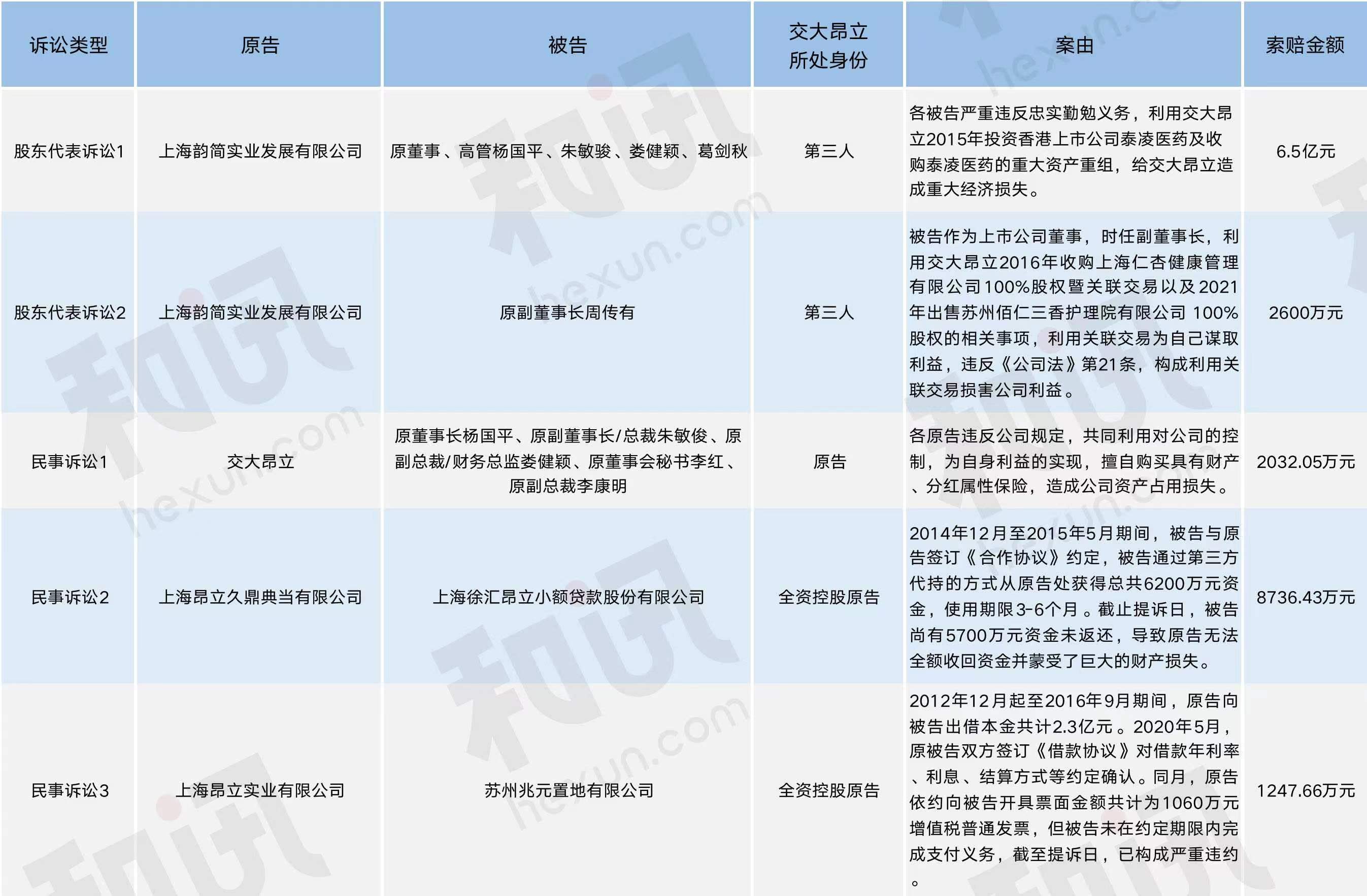 另外,交大昂立還作為第三人,對原董事、高管楊國平、朱敏駿、婁健穎、葛劍秋等提起股東代表訴訟,認(rèn)為他們利用2015年泰凌醫(yī)藥重大資產(chǎn)重組損害公司利益,并向4名被告索賠6.5億元。根據(jù)最新披露,該案已移送至上海市第一中級人民法院處理。