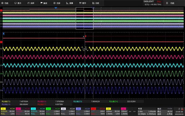 ·三相交流電分析,三相交流電廣泛應(yīng)用于需要高能效或大功率的機電設(shè)備,如三相逆變器、電機、驅(qū)動器等。逆變器廣泛應(yīng)用于家電、太陽能光伏發(fā)電、風能發(fā)電等,而在諸多汽車系統(tǒng)中,主驅(qū)、水泵、油箱冷卻系統(tǒng)都是由三相電所控制,對這些設(shè)備進行功率分析和電能質(zhì)量測量必不可少。使用SDS6000 Pro分析三相電時,其中3路接高壓差分探頭測量電壓,3路接電流探頭測量電流,這樣不僅能直接觀測到實時波形,還能利用數(shù)學(xué)運算進行各種信號處理得到電流有效值、視在功率、波峰因數(shù)、諧波失真等參數(shù)。
