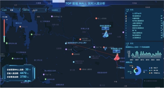 針對家裝MALL市場,家裝MALL為交點,結(jié)合家裝MALL周邊室分站負載信息,統(tǒng)計其實時人流情況,并利用B域數(shù)據(jù)對用戶畫像進行刻畫與分析,進行可視化展示,助力家裝市場商機挖掘,賦能精細化、個性化精準營銷。