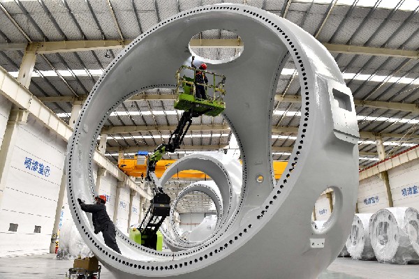 在山東省惠民縣風電裝備產(chǎn)業(yè)基地涂裝車間,工作人員對風電輪轂進行涂裝。
