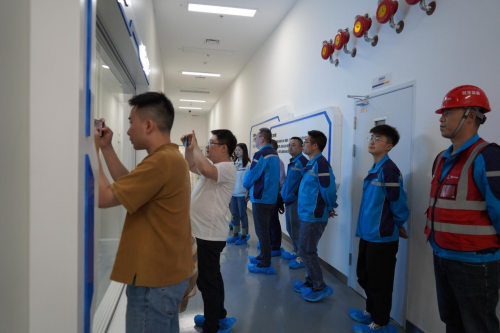 隨后,在項目團隊的帶領下,媒體嘉賓們走進施工一線,深入了解遂寧蜂巢能源項目施工建設歷程,感受寶冶“建精品工程、鑄長青基業(yè)”的企業(yè)使命。在已完工的1#綜合樓,項目經(jīng)理講解了1#建筑功能及周邊海綿城市應用情況,隨后經(jīng)過2#中試線,為大家介紹了廠房建筑特點及2#中試線工藝功能,在5#建筑電極及裝配車間的參觀通道內,記者們與項目管理團隊探討交流了相關廠房建筑特點及工藝流程,最后經(jīng)4#化成車間出廠區(qū)。