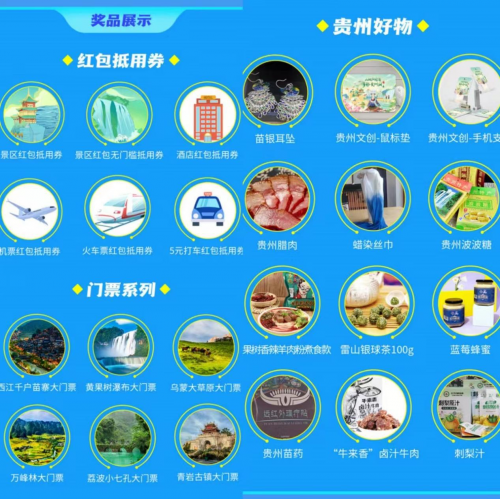 本次盲盒活動獎品重點突出貴州省內(nèi)景點、文創(chuàng)產(chǎn)品、特色美食。從貴州重點景區(qū)如西江千戶苗寨、黃果樹瀑布、烏蒙大草原、荔波小七孔的大門票,到苗銀耳墜、貴州臘肉、蠟染絲巾、貴州波波糖、貴州苗藥等貴州好物,好玩、好吃、好用一應俱全。此外,盲盒還提供景區(qū)、酒店、機票、火車票、打車紅包抵用券,誠意滿滿。