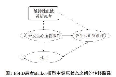 研究采用Markov模型法,將模型結(jié)構(gòu)分為未發(fā)生心血管事件(NCVD)、發(fā)生心血管事件(CVD)、死亡(death)三個獨(dú)立狀態(tài),模擬接受常規(guī)血液凈化以及聯(lián)合HA樹脂血液灌流的ESRD患者疾病進(jìn)程,計(jì)算接受不同治療方案患者的疾病成本與質(zhì)量調(diào)整壽命年(QALY)。模型循環(huán)周期為26周,研究時限為終生,評估不同治療方案患者的疾病成本與質(zhì)量調(diào)整壽命年。