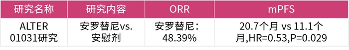 ALTER 01031的Ⅱ期隨機對照研究的結果表明,對比安慰劑,安羅替尼組的客觀緩解率(ORR)達到48.39%,可以顯著延長中位無進展生存期(mPFS)達9.6個月(20.7個月 vs. 11.1個月)[8],為晚期MTC患者帶來顯著的PFS及ORR獲益,并且安全性良好。安羅替尼甲狀腺髓樣癌適應癥的獲批,打破了國內(nèi)甲狀腺髓樣癌無靶向藥可用的局面,給患者帶來新希望。