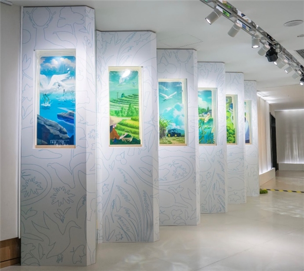 展覽以“水”的不同狀態(tài)為線索,串聯(lián)各個主題區(qū)域,包括沉浸式光影體驗的【水影】長廊、集合水域場景及可口可樂中國水資源保護項目插畫的【匯聚】區(qū)域、講述水與人和自然生態(tài)之間故事的【流變】區(qū)域和陳列紀念周邊的【流念】區(qū)域,引領(lǐng)觀眾走入“水”的世界,探索人與水的交織共生。