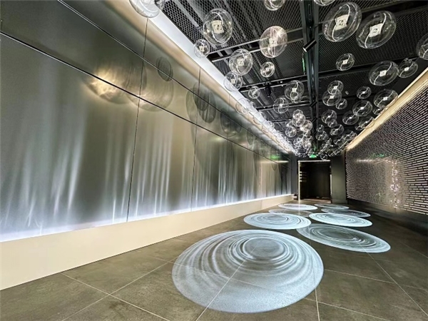【水影】長廊通過水滴掛墜、漣漪投影及名言墻打造沉浸式光影體驗