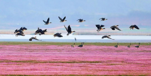 遠(yuǎn)山晚霞鋪滿天際,一群飛鳥(niǎo)掠過(guò)夢(mèng)幻花海,空氣中漂浮著沁人心脾的甜香……作為鄱陽(yáng)湖地區(qū)候鳥(niǎo)遷徙的第一站,馬影湖美得仿佛仙境落到了人間。