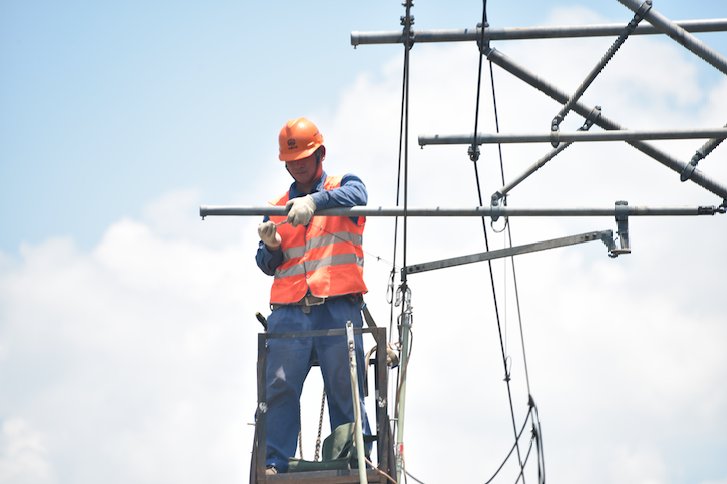 終于等到車梯豎起來,“扶好車梯!”剛囑咐好輔助人員,劉冉就帶著小李竄到了車梯上,現(xiàn)在的他只想早點干完活,早點休息??蓜傞_始干活沒一會,劉冉看著腕臂上動作又慢又變扭的小李就來了脾氣,“墨跡什么呢,身體貼在腕臂上干,搞快點!”“劉工,主要是這腕臂太燙了?!毙±詈芪慕忉尩?。不光線路上熱,此時支柱上的金屬設(shè)備因為曬了一上午,溫度已經(jīng)超過50℃,帶著手套還感覺不出來,但隔著一層薄衣服的話就燙的難受?!澳阏拒囂菘蚶锔?#xff0c;我過去?!笨吹皆O(shè)備溫度都這么高,此時的劉冉更擔心大家的身體,可千萬別中暑了啊。