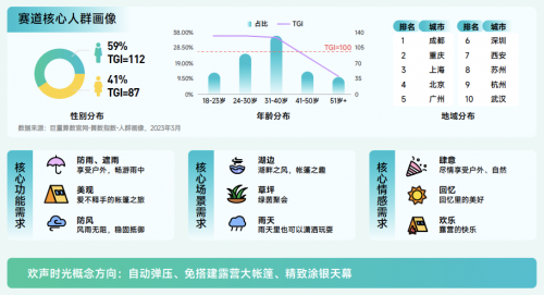 帳篷賽道解讀:該賽道抖音2022年搜索量同比增長228.6%,遠高于行業(yè)整體水平。該賽道的興趣群體以 31-40 歲的男性為主,主要分布地區(qū)涵蓋多個熱門旅游城市。隨著生活水平的提高和對自然休閑需求的增加,多功能帳篷在未來將更受歡迎,防雨、美觀和防風(fēng)等多重特性將滿足人們對于舒適和便利的需求。除此之外,在技術(shù)創(chuàng)新、多樣化產(chǎn)品、個性化定制、環(huán)保可持續(xù)發(fā)展等趨勢上,這一領(lǐng)域?qū)⒂袕V闊的市場前景。