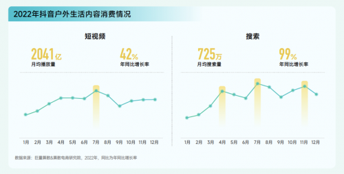 2022年戶外生活相關(guān)內(nèi)容在抖音上的受歡迎程度持續(xù)增長,月均播放量高達 2041 億次,同比增長 42%。除短視頻種草外,用戶主動搜索戶外生活內(nèi)容的意愿也更加強烈,月均搜索量達到 725 萬次,同比增長 99%。