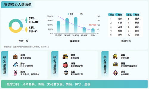 沖浪賽道解讀:2022年搜索量同比增長100.7% 。用戶以男性為主,集中在北上廣一線城市。24-40 歲人群對沖浪潛水更感興趣。相對來說,對于沖浪潛水用戶更注重便捷、排水等功能。未來,隨著技術(shù)的發(fā)展和人們對海洋環(huán)境保護意識的增強,沖浪運動將更加注重舒適、安全和環(huán)保,并可能推出更具創(chuàng)新性的裝備,產(chǎn)生新的活動形式。