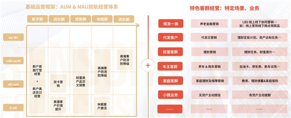 在 MAU + AUM 雙軌客群經(jīng)營(yíng)模式下,接入特色客群、業(yè)務(wù)條線的經(jīng)營(yíng)體系,進(jìn)行經(jīng)營(yíng)策略補(bǔ)碼,完善經(jīng)營(yíng)策略體系,使得線上經(jīng)營(yíng)更加立體。MAU + AUM 雙軌客群經(jīng)營(yíng)模式在基礎(chǔ)運(yùn)營(yíng)框架體系中增加了“生命周期”的維度,生命周期是培育客戶的過(guò)程。金融機(jī)構(gòu)還可以在基礎(chǔ)框架上根據(jù)特定的業(yè)務(wù)場(chǎng)景和主題,制定相應(yīng)的經(jīng)營(yíng)策略。
