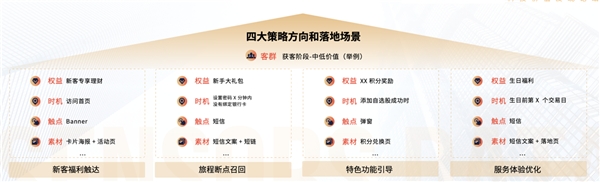 ? 業(yè)務(wù)策略:匹配業(yè)務(wù)特點(diǎn)和經(jīng)營(yíng)目標(biāo)的經(jīng)營(yíng)策略體系,不同業(yè)態(tài)的業(yè)務(wù)策略和場(chǎng)景不同,可嘗試創(chuàng)新的點(diǎn)也不同;匹配業(yè)務(wù)與客群特點(diǎn)的渠道定位和場(chǎng)景建設(shè)