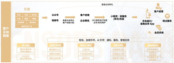 金融企業(yè)在客戶全鏈路互動(dòng)與經(jīng)營(yíng)上,涉及到的渠道觸點(diǎn)也比較多。通常,在引流階段,客戶通過(guò)交易型 App、資訊類(lèi) App、種草媒體等進(jìn)行互動(dòng),之后進(jìn)入公眾號(hào)、視頻號(hào)為主的公私域轉(zhuǎn)換的形態(tài),如果轉(zhuǎn)化周期較長(zhǎng),還會(huì)通過(guò)客戶經(jīng)理和企業(yè)微信進(jìn)行 1V1 服務(wù)引導(dǎo)和關(guān)系維護(hù),還可以直接導(dǎo)量到小程序或 H5 進(jìn)行輕轉(zhuǎn)化,以及到手機(jī)銀行、金融業(yè)務(wù) App,結(jié)合客戶經(jīng)理、網(wǎng)點(diǎn)服務(wù)和會(huì)員系統(tǒng)加強(qiáng)后鏈路深度運(yùn)營(yíng)。