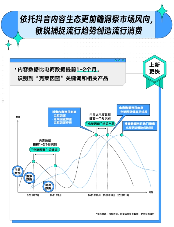 看似無序的消費決策遵循一套基礎(chǔ)邏輯,比如購買普遍發(fā)生在瀏覽和搜索之后。所以,內(nèi)容數(shù)據(jù)和搜索數(shù)據(jù)可以被視為交易的前置指標,它們能夠更早預測未來交易走向。正是基于這一結(jié)論,擁有內(nèi)容場監(jiān)測能力的巨量云圖能更快識別出新品市場機會,為品牌上新提供參考。