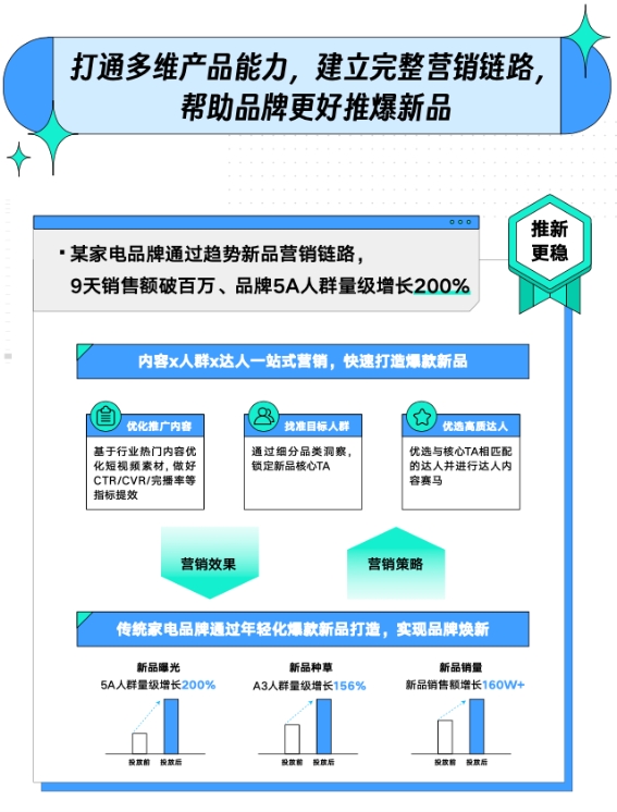 如果說前期洞察和測品是成功的基石,那么能否應對上市后的這些問題,決定了新品可否走好成功前的最后一里路。在「新品C位出道指南」中,巨量云圖場景運營模塊下的「趨勢新品營銷」等功能讓品牌推新更穩(wěn)健。