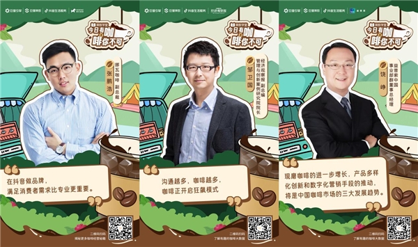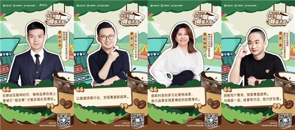 為此《算數(shù)學(xué)堂》重磅推出《今日有咖·啡你不可》欄目,聚焦咖啡賽道,為品牌商家們指點(diǎn)迷津,并邀請了8位重磅嘉賓,專業(yè)覆蓋咖啡生態(tài)各個(gè)環(huán)節(jié),包括消費(fèi)行業(yè)專家2位、咖啡品牌商家代表2家、品牌代理服務(wù)商1家、抖音生活服務(wù)專家2位、巨量引擎商業(yè)分析1位,他們將分別從各自的領(lǐng)域出發(fā),分享有關(guān)咖啡行業(yè)未來趨勢、品牌經(jīng)營方法論、抖音平臺數(shù)字化營銷秘籍等真知灼見。