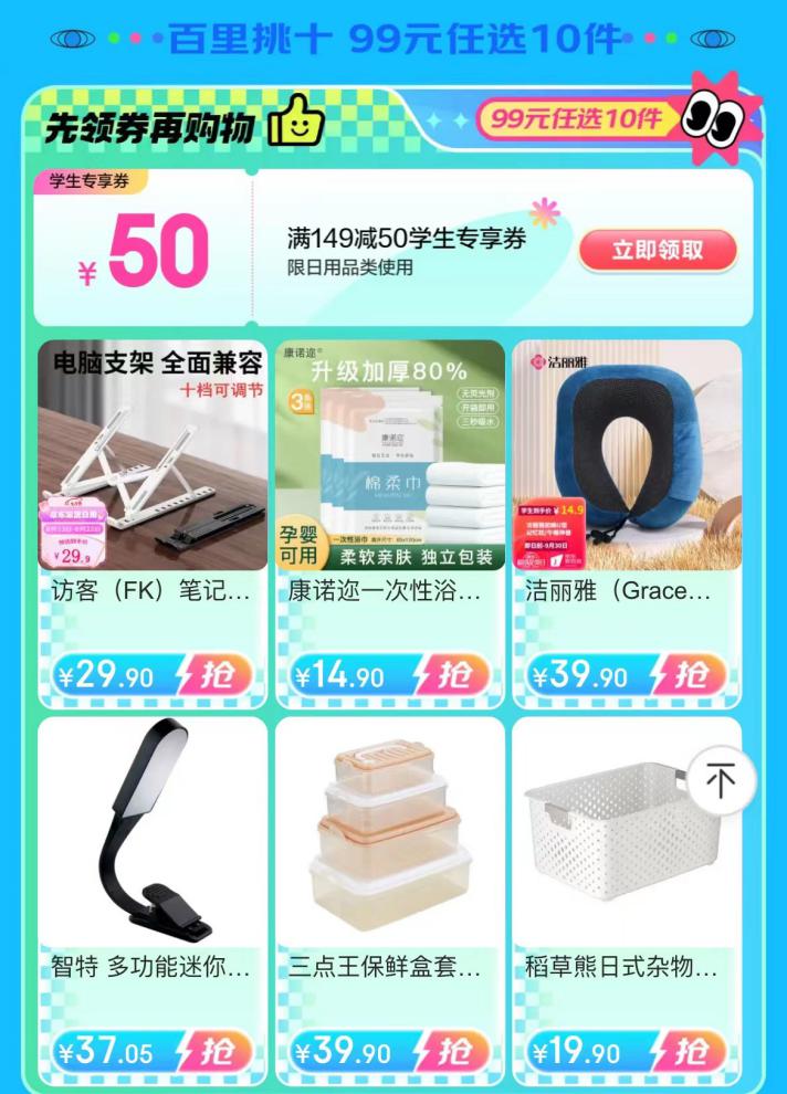 為了讓學(xué)生們省錢煥新,京東開學(xué)季特設(shè)“百里挑十 ”專區(qū),雜物收納籃、筆記本電腦支架、泡腳盆、毛巾、水果刀、除螨噴霧等剛需好物99元任選10件,更有搬家打包收納袋、真空壓縮包、抽屜式桌面收納盒、衣服收納筐等海量商品享低至5折的學(xué)生折扣,為學(xué)生們帶來超值優(yōu)惠。