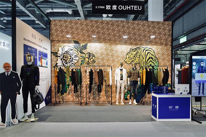 除了注重客戶體驗,現(xiàn)場服裝陳列搭配及展館搭建也很有講究。展廳內(nèi),第三代OT原創(chuàng)圖案與前Gucci設(shè)計師Paola Smania的“虎嗅薔薇”聯(lián)名印花,交相輝映,彰顯著歐度品牌的風(fēng)格與調(diào)性。墻面上老花、猛虎、花卉幾大元素渾然天成,帶來強烈的視覺藝術(shù)美感。左側(cè)墻面還展出了《歐度與清華大學(xué)藝術(shù)與科學(xué)研究中心色彩研究所》有關(guān)中國男裝色彩研究的合作報告。