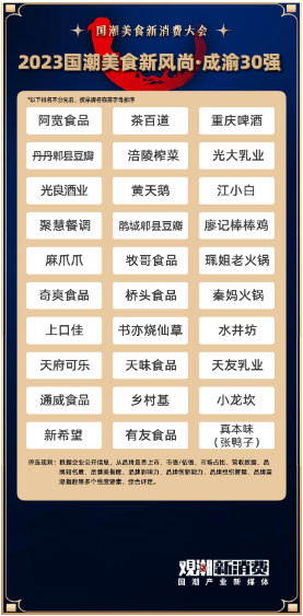 國潮品牌之夜是一場專屬中國美食品牌的加冕之夜。在借由盛典彰顯國潮美食風(fēng)尚之余,觀潮新消費還發(fā)布了《2023國潮美食新風(fēng)尚·成渝30強》,旨在打造成渝核心企業(yè)標(biāo)桿,描繪區(qū)域食品工業(yè)發(fā)展藍(lán)圖,為進(jìn)一步推動企業(yè)創(chuàng)新、深化產(chǎn)業(yè)合作、實現(xiàn)成渝經(jīng)濟高質(zhì)量發(fā)展提供參考。