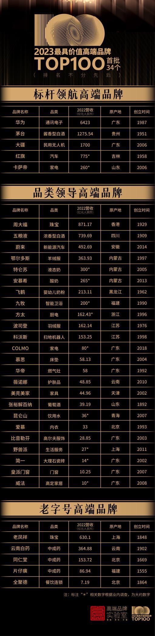 這份擁有34個(gè)品牌的榜單分為三類(lèi):標(biāo)桿領(lǐng)航品牌榜、品類(lèi)領(lǐng)導(dǎo)品牌榜和老字號(hào)品牌榜。發(fā)布方表示,首批標(biāo)桿領(lǐng)航品牌榜有5個(gè)品牌入圍:華為、茅臺(tái)、卡薩帝、大疆、紅旗。它們的入圍標(biāo)準(zhǔn)是:擁有全球化的經(jīng)營(yíng)和影響力、100億以上的營(yíng)收規(guī)模和公認(rèn)的高端市場(chǎng)地位?!袄献痔?hào)品牌榜”的推出旨在支持中國(guó)老字號(hào)品牌的建設(shè),入選的五個(gè)品牌——老鳳祥、云南白藥、同仁堂、片仔癀、全聚德,顯示中華老字號(hào)擁有廣闊的品牌建設(shè)空間。至于品類(lèi)領(lǐng)導(dǎo)品牌則囊括了近20多個(gè)細(xì)分行業(yè)(品類(lèi))的24個(gè)領(lǐng)導(dǎo)品牌,它們基本是這些細(xì)分行業(yè)的品類(lèi)冠軍。