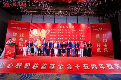 下午,愛心聯(lián)盟慈善基金會成立十五周年盛典隆重舉行。全國勞動模范、全國五一勞動獎章獲得者、全國道德模范、吉林省工商聯(lián)副主席、吉林省河南商會會長、愛心聯(lián)盟慈善基金會理事長李萬升,河南省政府駐上海辦副主任胡華杰,哈爾濱市政府駐上海辦經協(xié)處處長田磊,中國浦東干部學院黨建研究中心主任吳濤,上海中信國旅總經理羅良剛,山東馳恒投資發(fā)展有限公司董事長王久紅,昆山物流協(xié)會會長孫喜,來伊份股份有限公司高級副總裁趙漢利,新希望集團草根資本投資部部長許云龍,上海歐邦醫(yī)療管理有限公司創(chuàng)始人崔海茹,眼界(上海)健康管理有限公司創(chuàng)始人謝攖寧,浙江省有機產業(yè)協(xié)會理事長胡珊,上海妃魚股份高級副總裁李財鋒,愛心聯(lián)盟慈善基金會執(zhí)行理事長楊崢,以及上海市工商聯(lián)直屬商會和各省市在滬異地商會秘書長等來自全國各地的精英和愛心聯(lián)盟成員300余人歡聚一堂,共同慶祝愛心聯(lián)盟慈善基金會成立十五周年。