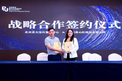 活動(dòng)現(xiàn)場(chǎng),北京北大寶石鑒定中心與北京真心紅珠寶有限公司還舉辦了現(xiàn)場(chǎng)簽約儀式,雙方將在珠寶鑒定、數(shù)字化溯源以及從業(yè)人員專(zhuān)業(yè)培訓(xùn)等多個(gè)版塊開(kāi)展豐富的合作。